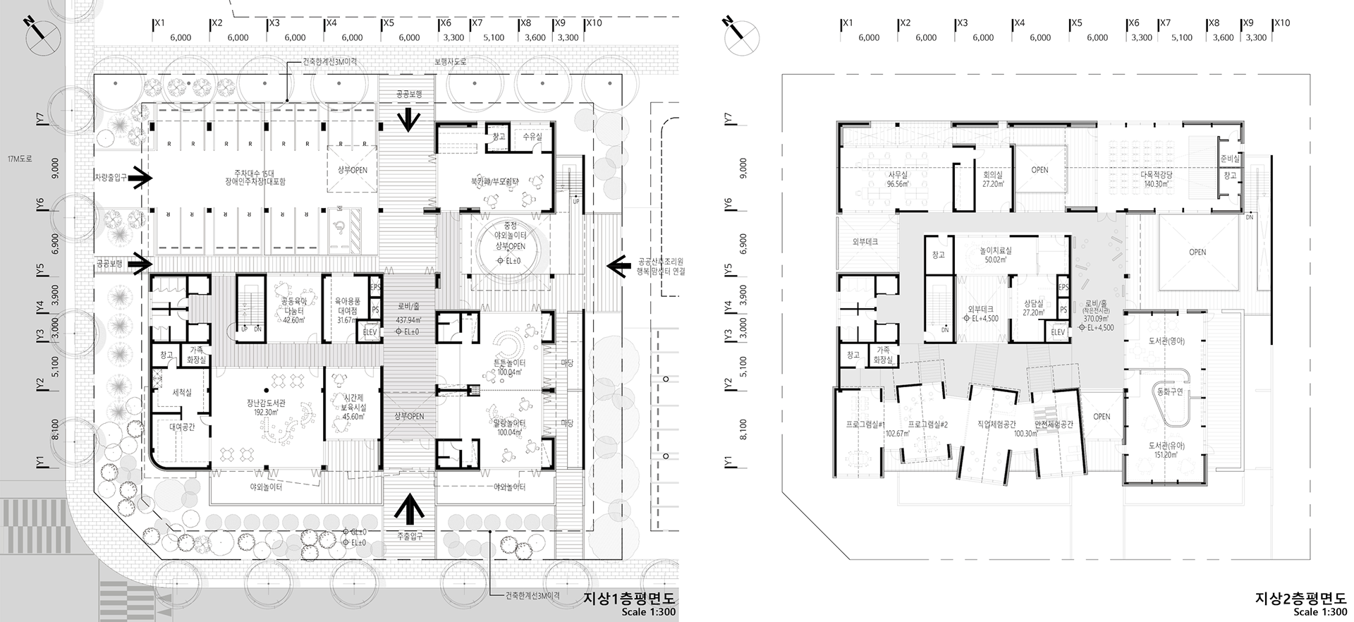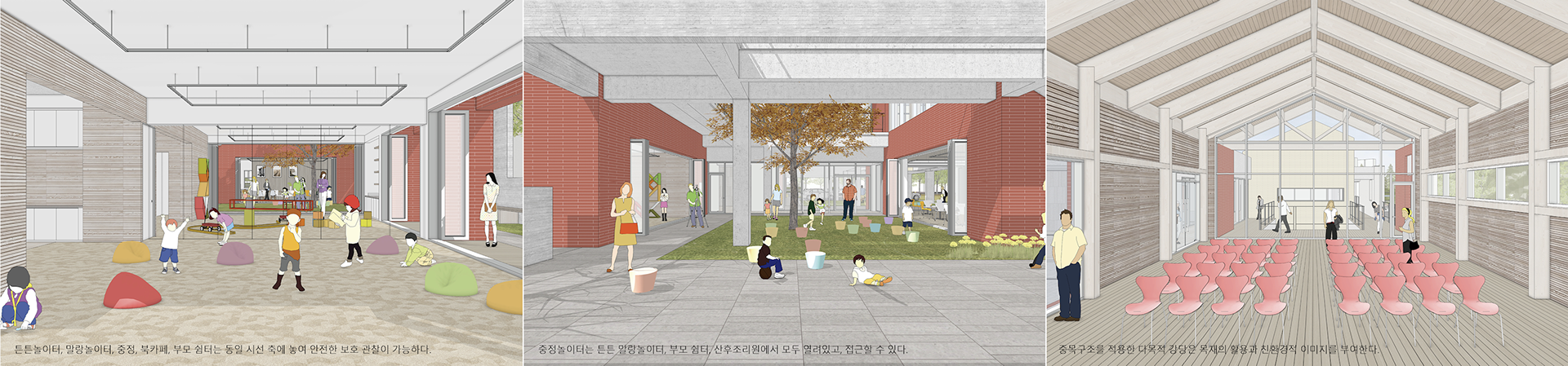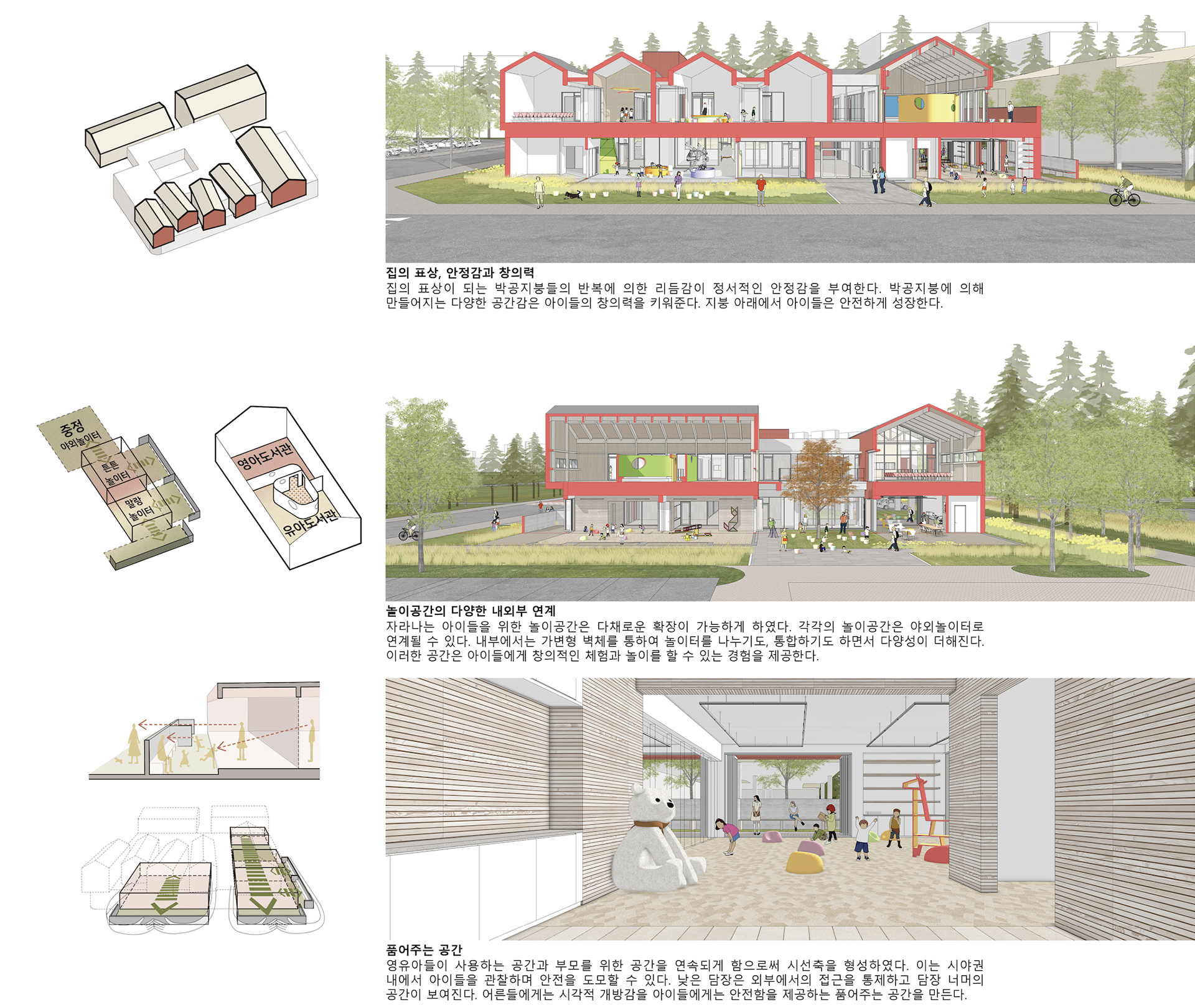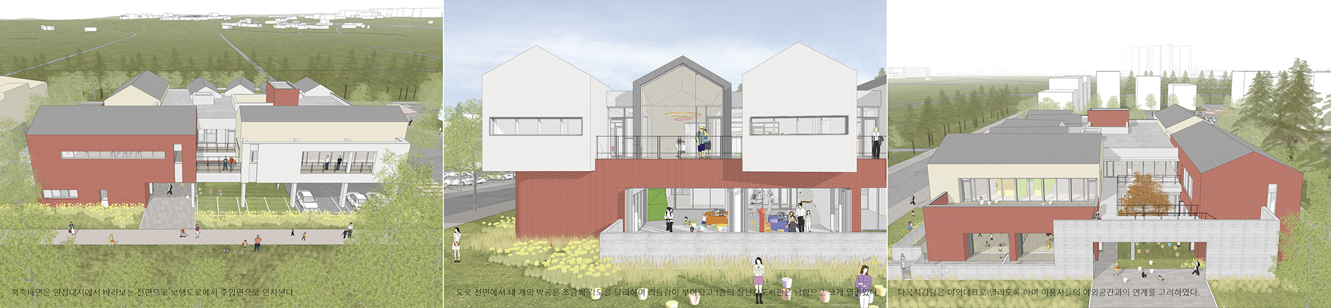 우리가 살고 있는 도시 마저도 양극화 현상이 도드라진다. 거대도시는 거품이 줄지 않고 지방도시는 소멸이라는 위기감에 더욱 위축되고 있다. 젊은 세대들의 유출은 가속화 되고 미래를 위한 인프라의 구축은 중소도시의 부담감으로 작용한다. 이러한 일련의 지속에서 도시와 건축의 방향성은 좀 더 또렷한 구상이 필요하다. 최근 중소도시 공공건축은 지역의 활력과 새로운 세대 구성원들을 지원하는 시설 공급에 적극적인 행보를 보이고 있다. 거창군 육아드림센터 또한 동일한 과정의 선상이라 볼 수 있다. 대지는 이미 인접하여 공공산후조리원과 행복맘센터와 연계하여야 하는 위치에 있다. 우리는 이곳에 과거부터 인식되어 온 집의 표상을 다시 가져옴으로 인해 안전성이 보장되고 다양한 공간적 체험이 될 수 있는 형태를 제안한다. 우선 행복맘센터의 주차장 위치로 인해 보행자가 차량으로 단속되지 않는 위치에 주차장을 배치하고 전면도로와 후면 보행도로에서 접근이 될 수 있게 하였다. 또한 맘센터에서 중정을 경유하고 공유할 수 있게 하였다. 튼튼, 말랑 놀이터 공간은 연속되고 각각 외부 공간과 이어질 수 있게 하였고 부모들은 쉼터에서 아이들 시야권에 머무를 수 있게 하였다. 주차장이 북서측 공간으로 배치됨에 따라 남향으로 면한 공간이 많아 졌으며, 보행공간에 교차가 발생하지 않아 안전한 이용이 가능하다. 체험실과 프로그램실은 모두 가변형 벽체로 구획하여 공간의 조합으로 다양한 규격이 제공되며, 앞서 얘기한 집의 표상으로 남은 박공 지붕과 조금씩 어긋나게 바라보는 방향성은 공간조합에 따라 공간감의 변화가 생겨난다. 외부공간의 담장은 외부에서 접근은 제한하지만 시야는 확보되게 함으로써 내부관찰과 외부통제가 가능하다. 거창군 육아드림센터는 공공건축이 다음 세대를 아울러 품을 수 있는 공간을 제안하고 있다.