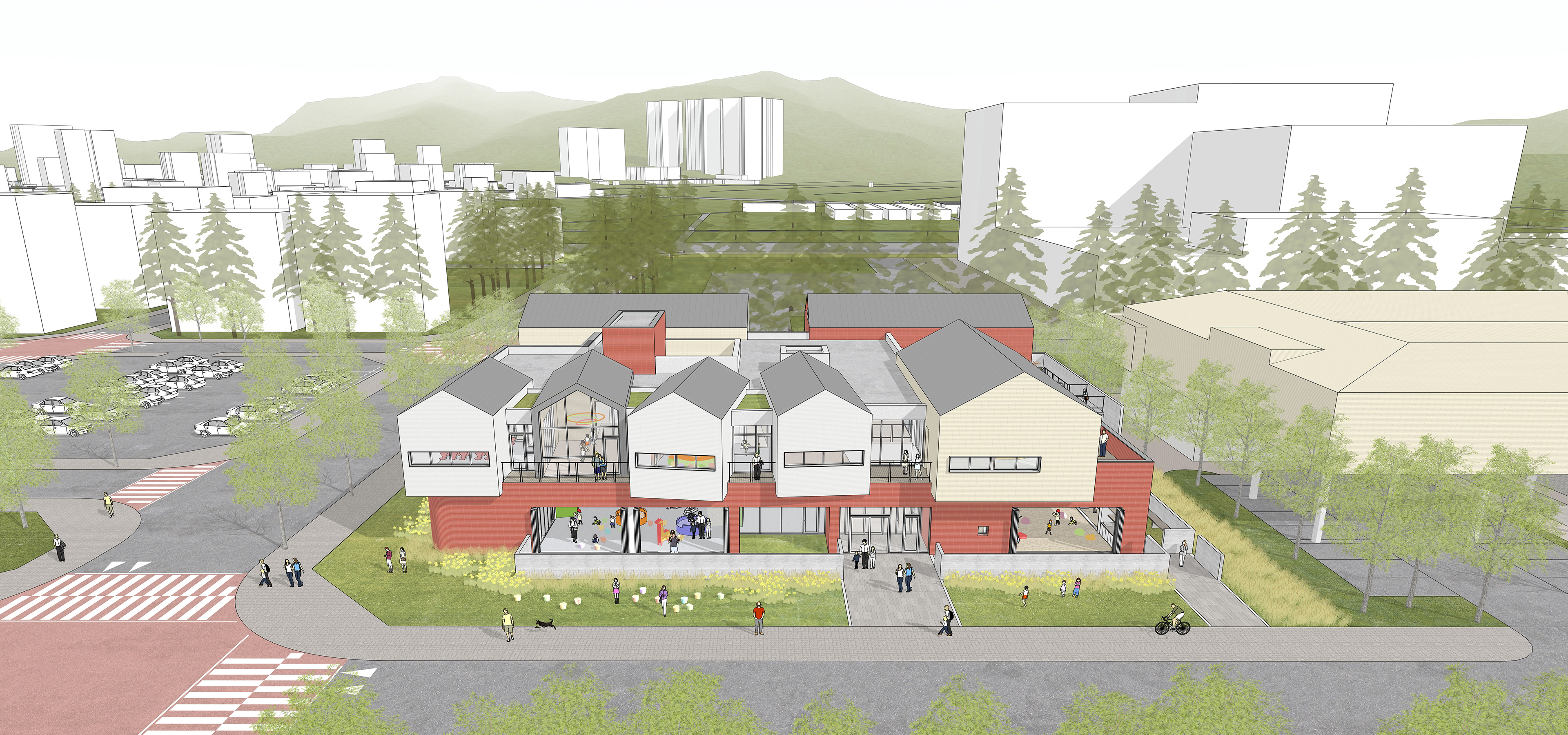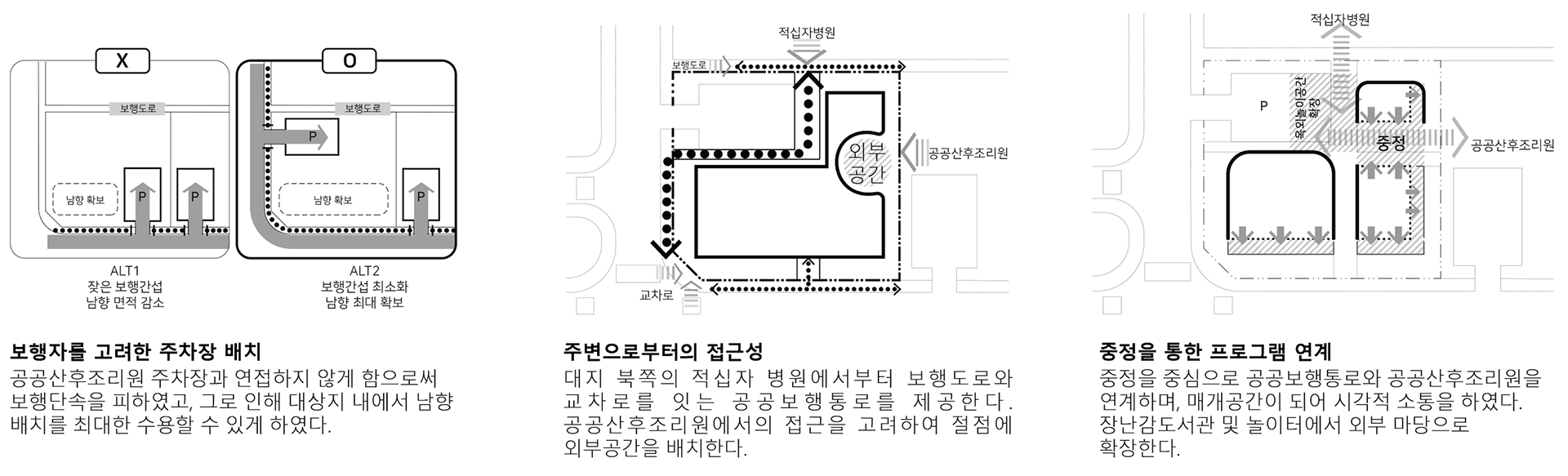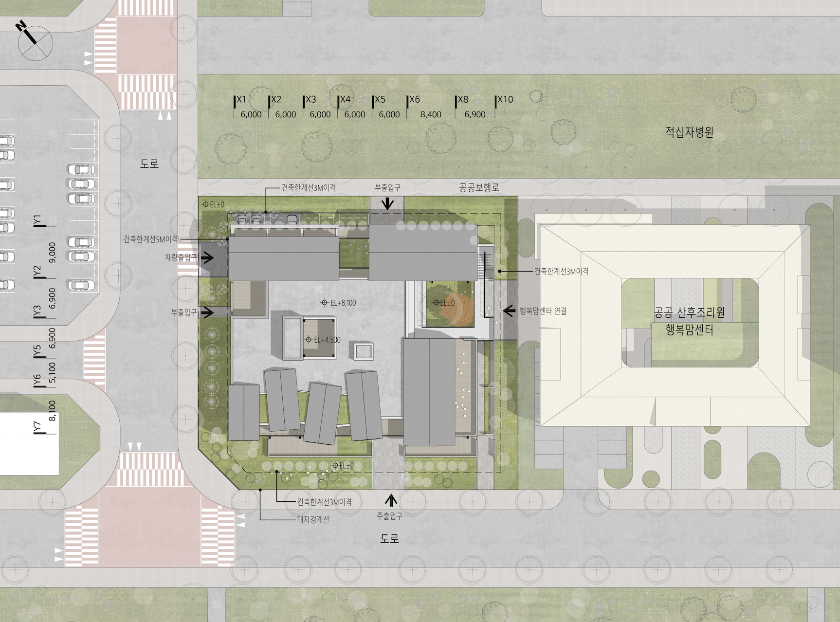 우리가 살고 있는 도시 마저도 양극화 현상이 도드라진다. 거대도시는 거품이 줄지 않고 지방도시는 소멸이라는 위기감에 더욱 위축되고 있다. 젊은 세대들의 유출은 가속화 되고 미래를 위한 인프라의 구축은 중소도시의 부담감으로 작용한다. 이러한 일련의 지속에서 도시와 건축의 방향성은 좀 더 또렷한 구상이 필요하다. 최근 중소도시 공공건축은 지역의 활력과 새로운 세대 구성원들을 지원하는 시설 공급에 적극적인 행보를 보이고 있다. 거창군 육아드림센터 또한 동일한 과정의 선상이라 볼 수 있다. 대지는 이미 인접하여 공공산후조리원과 행복맘센터와 연계하여야 하는 위치에 있다. 우리는 이곳에 과거부터 인식되어 온 집의 표상을 다시 가져옴으로 인해 안전성이 보장되고 다양한 공간적 체험이 될 수 있는 형태를 제안한다. 우선 행복맘센터의 주차장 위치로 인해 보행자가 차량으로 단속되지 않는 위치에 주차장을 배치하고 전면도로와 후면 보행도로에서 접근이 될 수 있게 하였다. 또한 맘센터에서 중정을 경유하고 공유할 수 있게 하였다. 튼튼, 말랑 놀이터 공간은 연속되고 각각 외부 공간과 이어질 수 있게 하였고 부모들은 쉼터에서 아이들 시야권에 머무를 수 있게 하였다. 주차장이 북서측 공간으로 배치됨에 따라 남향으로 면한 공간이 많아 졌으며, 보행공간에 교차가 발생하지 않아 안전한 이용이 가능하다. 체험실과 프로그램실은 모두 가변형 벽체로 구획하여 공간의 조합으로 다양한 규격이 제공되며, 앞서 얘기한 집의 표상으로 남은 박공 지붕과 조금씩 어긋나게 바라보는 방향성은 공간조합에 따라 공간감의 변화가 생겨난다. 외부공간의 담장은 외부에서 접근은 제한하지만 시야는 확보되게 함으로써 내부관찰과 외부통제가 가능하다. 거창군 육아드림센터는 공공건축이 다음 세대를 아울러 품을 수 있는 공간을 제안하고 있다.