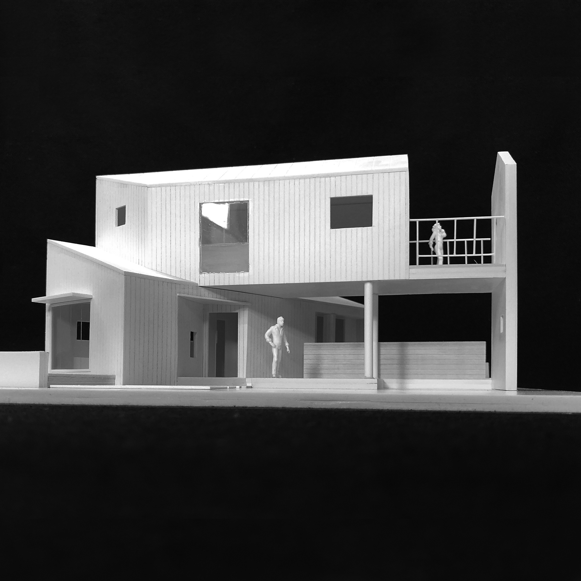 외부의 형태도 두 MASS가 다르다. 아내의 공간은 편경사 지붕이다. 방과 툇마루의 천장높이를 다르게 하기 위해서 한쪽 경사로 하였다. 반면 남편의 공간은 박공의 형태로 안정적인 모습을 보이게 하였고, 전체적인 높이가 높아지지 않게 하였다. 엇갈린 두공간이 만나는 부분은 모호한 형태로 일부분이 쏟아 있다. 그리고 두 공간의 외피는 탄화적삼목으로 동일하게 하여 형태에서 잃었던 일관성을 찾았다.