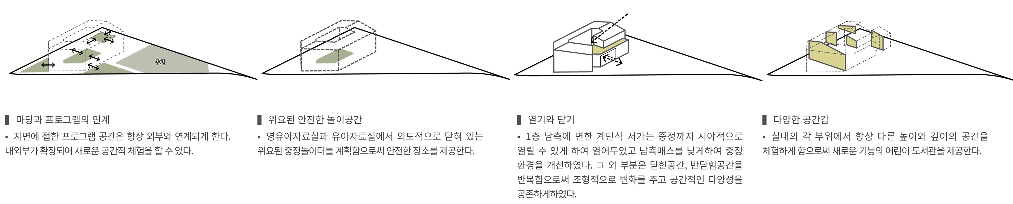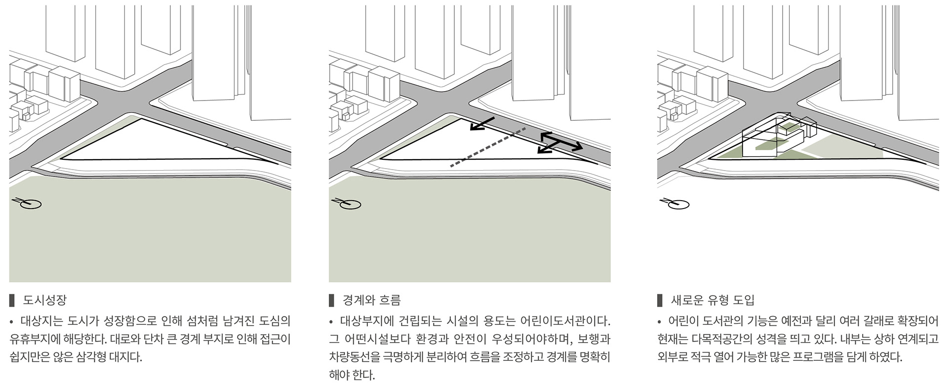 ‘여수시어린이도서관’은 확장되는 도심에서 구심점 역할을 하게 될 공공시설 이다. 도시의 유휴공간에 세워지는 어린이 도서관인 셈이다. 뿐만 아니라 어린이 도서관의 역할은 정독을 위한 공간 뿐만 아니라 놀이를 통한 학습의 기능이 추가되어야 한다. 이것은 미래 도서관의 가능성을 내포하고 있다. 그러기 위해서는 경계를 없애고 공간은 연속되어야 한다. 어린이도서관을 계획함에 있어 주안점으로 삼았던 것은 ‘안전한 책읽기’와 더불어 ‘놀이’였다. 실내외를 연계하고 프로그램에 맞추어 외부공간을 배치하였다. 그리고 위요된 중정을 제공함으로써 부모도 아이도 좀 더 안심할 수 있는 공간을 만들고자 하였다. 이 도서관은 단단한 외피를 가졌다. 그렇지만 따뜻하다. 벽돌을 사용하였고, 영롱쌓기(다공쌓기)를 통해 닫힌 듯 열려있으며, 폭이 좁은 공간은 개방감을 높였고, 시야는 관통하게 하였다. 중정을 향해 개방되어 있으며, 날 좋은 어느날 중정은 매개공간이 된다. 직접외기를 접하기도 하고 피로티 공간의 반외부를 경유하는 등 실내의 프로그램을 실외로 확장할 수 있다. 여수시 어린이도서관은 공동육아나눔터를 포함하는 복합화 SOC시설이다. 공동육아나눔터-놀이마당-카페로 이어지는 시각적 연계로 이 곳을 찾은 아이들이 부모의 시야권 내에서 안전하게 즐길 수 있게 하였다.