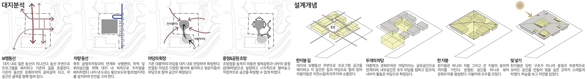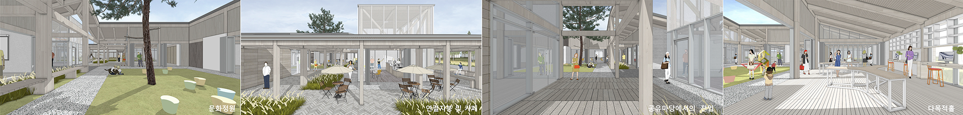 의좋은 문화뜨락은 기초생활거점조성사업으로 지역 주민을 위한 문화 서비스를 제공하는 시설로 일상 및 문화예술 프로그램 운영을 목적으로 하고 있다. 대상지 북측의 공영주차장과 동측 의좋은 형제공원에 인접해 있어 지역주민들의 자유로운 이용이 용이하며 지역 거점 브랜드로 활용이 가능하다. 우리는 이 곳에 예부터 있었던 마을의 구성 질서를 유지하면서 분절된 요소를 지붕이라는 요소로 엮을 수 있게 하였다. 하나의 지붕 그리고 큰지붕은 그동안 익히 보아왔던 전통적 구성의 현대적 재현이다. 의좋은 문화뜨락은 완전개방과 예약제 등으로 시간대별, 이용자별 다양성을 가지고 있어 쓰임에 따른 닫힘과 열림 공간을 구분함으로써 의좋은 한지붕, 즉 가족이 될 수 있게 하였다.